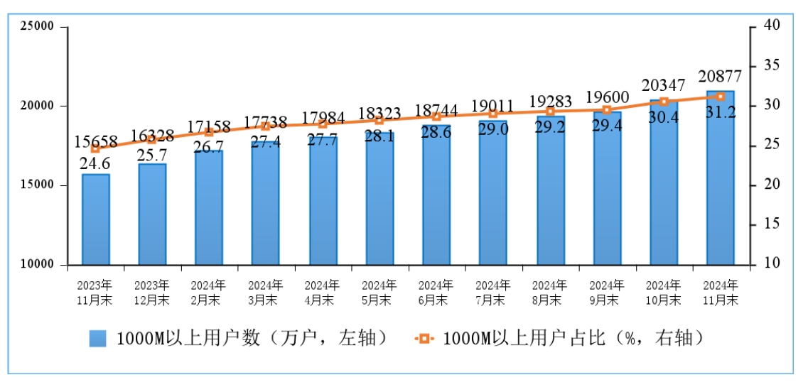摘要:据中商情报网消息,2024 年 11 月末,我国千兆宽带用户达 2.09 亿户,比上年末净增 4549 万户,占总用户数的 31.2%,占比较上年末提升 5.5